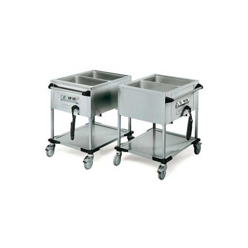 Bain marie trolley type ZUB 2-GL RIEBER Dimensions WxDxH: 816 x 717 x 900 mm Storage capacity: 2 x GN 1/1 Temperature range: +30 °C / +110 °C Heated wet or dry 4 wheels, 2 swivel with brakes, plastic bumper on each corner Finish: Stainless Steel Electrical connection: 230/50/1 0,94kW