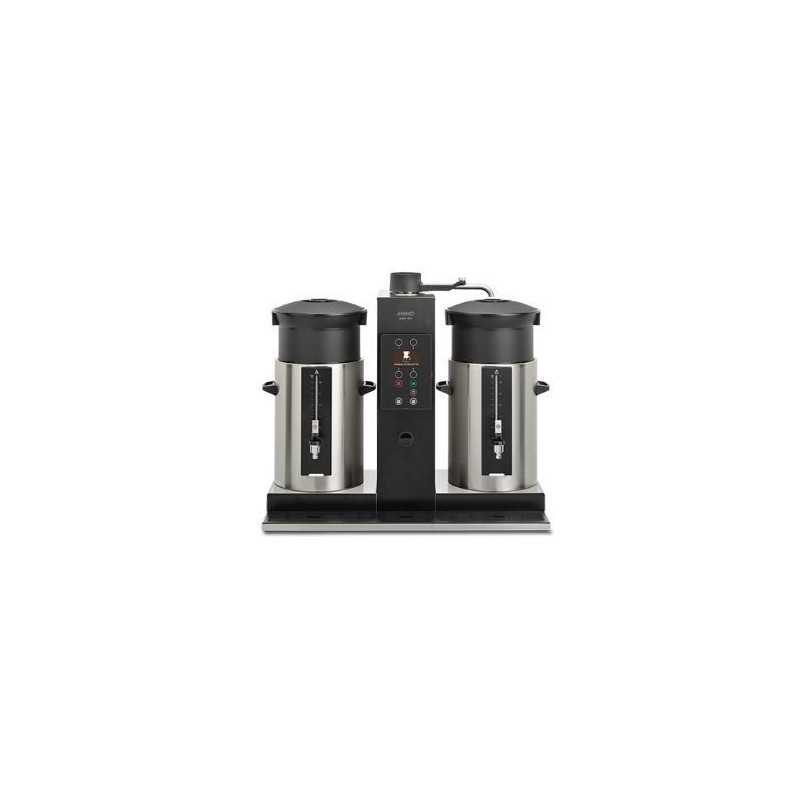 Coffee Brewer type ComBi-line CB 2x 20W ANIMO Dimensions WxDxH: 1095 x 500 x 895 mm With water connection - with separate hot water heater Capacity: 2x20L Throughput per hour: coffee: approx. 90 L, water: 60L Finish: 18/9 Stainless steel capacitive touch user interface, swivel arm protection, container detection, soft start, timer, coffee-ready signal, coffee dosing advice, total and day counters. The containers are provided with an integrated gauge glass and no-drip tap. Sold with synthetic filter, drip tray with grid, coffee blender, scale and coffee fur remover with funnel, extra gauge glass, gaugeglass brush and basket filter paper for the first brews. Electrical connection: 400/3/50-60 Hz 9275W (other voltage on request)