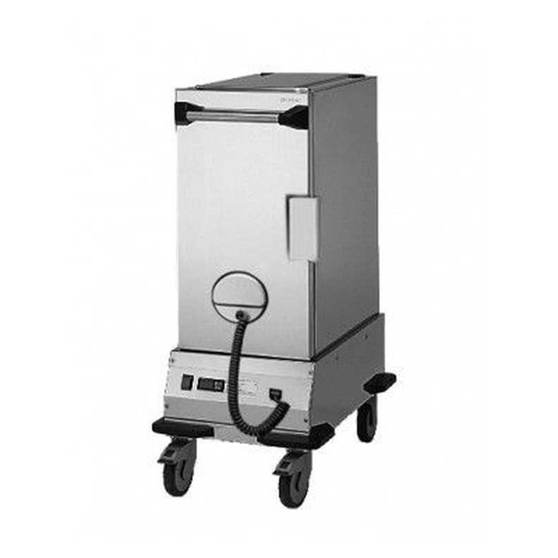 Cooled holding trolley type Thermoport 1600K RIEBER Dimensions WxDxH: 492 x 769 x 1130 mm Storage capacity: 16 levels - GN 1/1 Temperature range: +2 °c / +8 °C 4 wheels, 2 swivel with brakes, plastic bumper on each corner Finish: Stainless Steel Electrical connection: 230/50-60/1 0,17kW