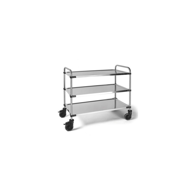 Serving & clearing trolley type SW-850RL-3S RIEBER Dimensions WxDxH: 575 x 875 x 950 mm Storage capacity: 3 shelves (800x500) 4 wheels, 2 swivel with brakes, plastic bumper on each corner Finish: Stainless Steel